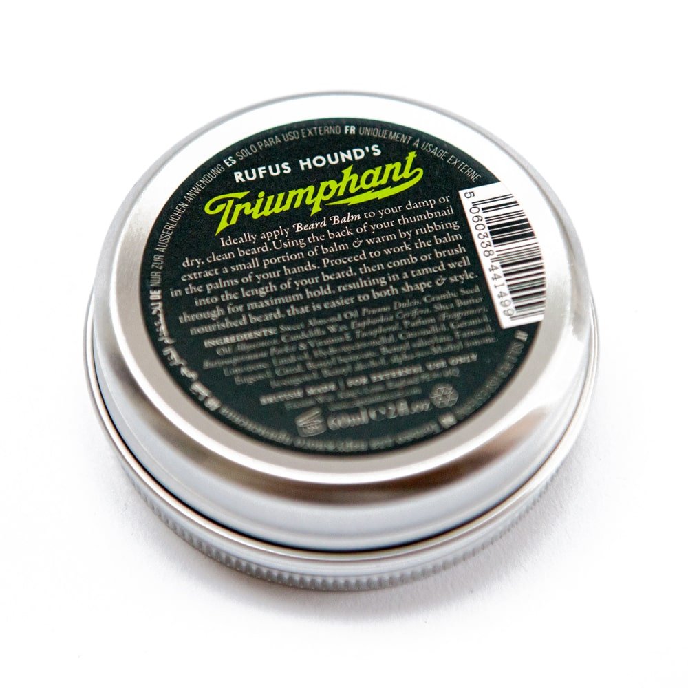 Balzam za bradu „Triumphant“ nastao je u saradnji sa glumcem i komičarem Rufus Hound-om. Kako možemo opisati ovaj miris? Sjednite na svoj motor, stavite kacigu i uputite se kroz Engleske predjele ispunjene mirisima proljeća. Gornje note bergamota, limete i yling ylang-a idealno su kombinovani sa donjim notama sandalovine i mošusa odličan su recept za svakog modernog gospodina.