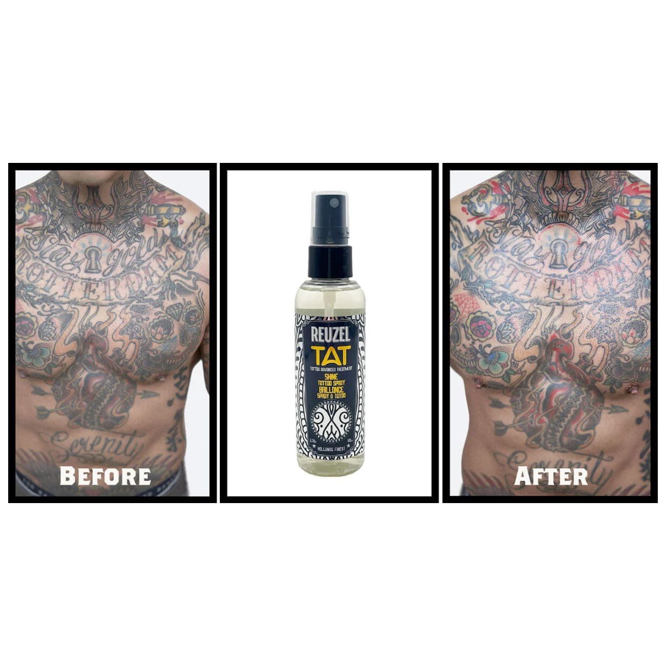 Reuzelov sprej za njegu tetovaža se jako brzo upija, otkriva definiciju i čini da vaše boje dođu do izražaja, bez ostavljanja masnih tragova.